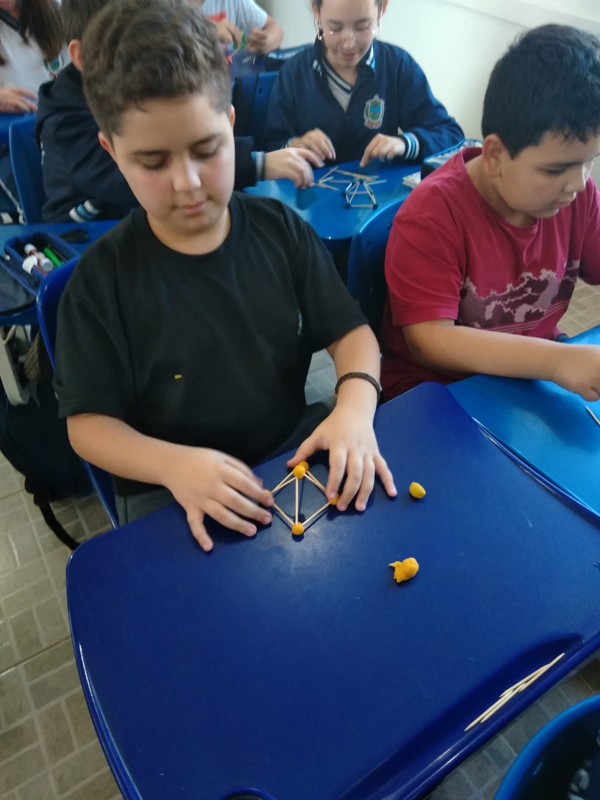 Depois dos registros e das conversas com os alunos foi hora de por a mão na massa, literalmente. Para compreender mais sobre os conceitos de arestas e vértices, os alunos montaram protótipos de cubos e pirâmides utilizando massa de modelar e palitos.
